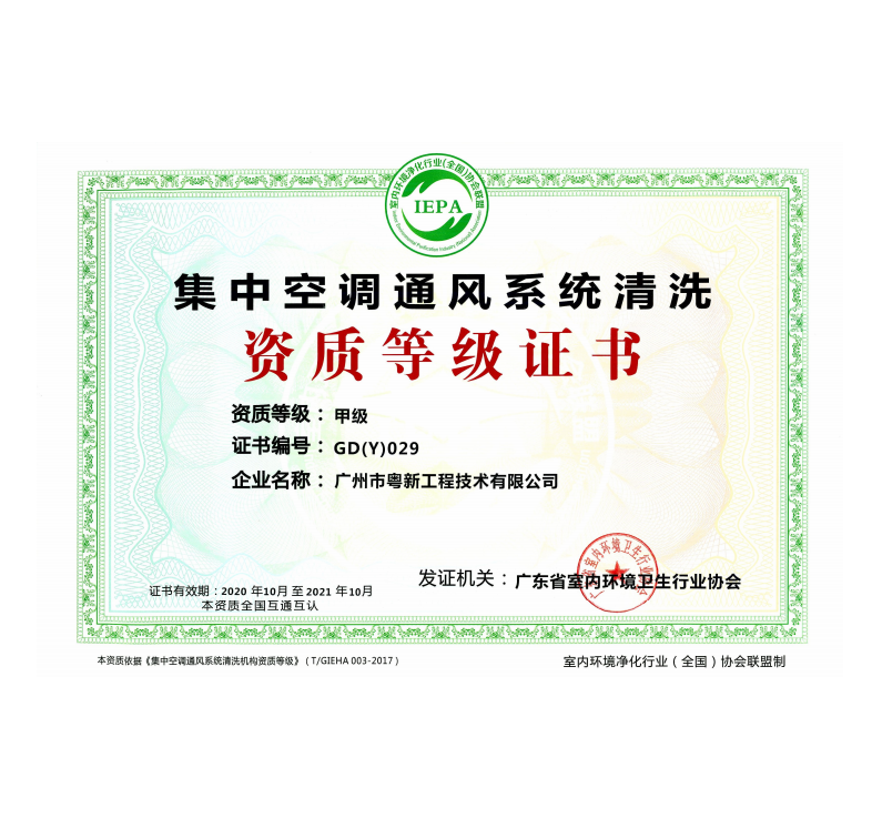 集中空調(diào)通風(fēng)系統(tǒng)清洗資質(zhì)等級證書(甲級)